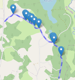 Figure 3. Interventions during night (left) and winter (right) driving with the LiDAR model. The map also depicts land usage: dark green denotes forest while light green denotes agricultural land. Grey areas are of an unspecified usage, mostly residential use with private houses, partially fenced gardens. On the winter trajectory, there is only one intervention in the forest, while more open areas prove challenging for the summer-trained LiDAR model in the winter.